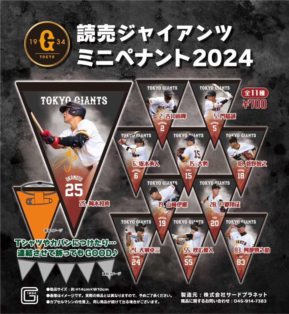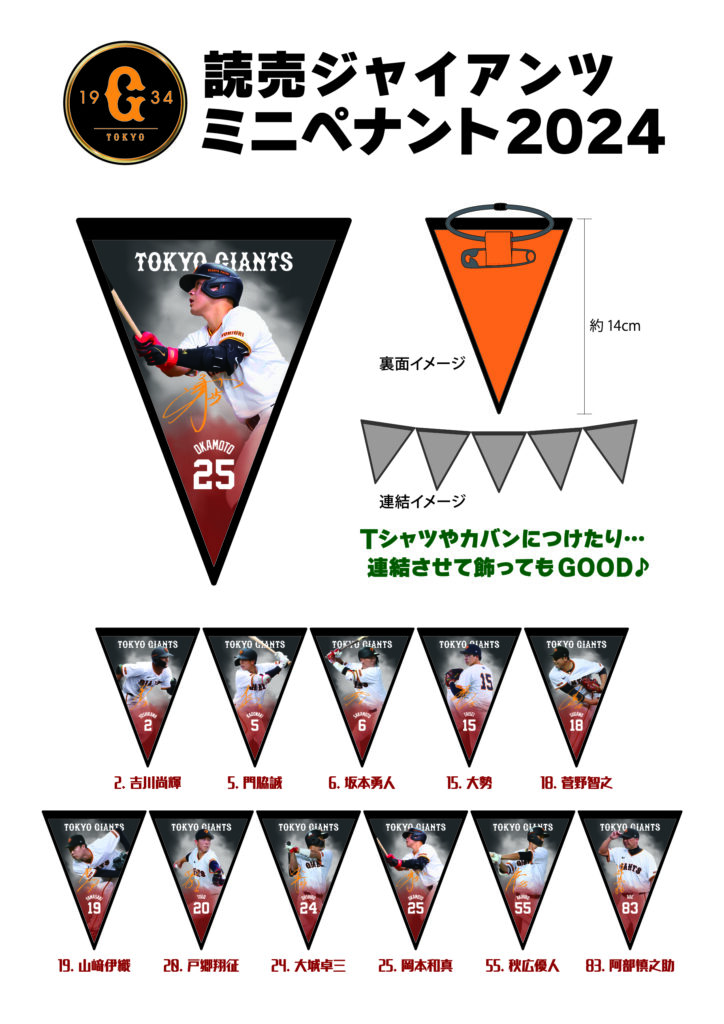 讀賣巨人迷你三角旗 2024 將於 8 月 23 日起在東京巨蛋的 GIANTS STORE AMUSEMENT 發售。三角旗配有安全別針,因此您可以將其固定在 T 卹或包包上,甚至可以將它們連接在一起!請檢查一下!