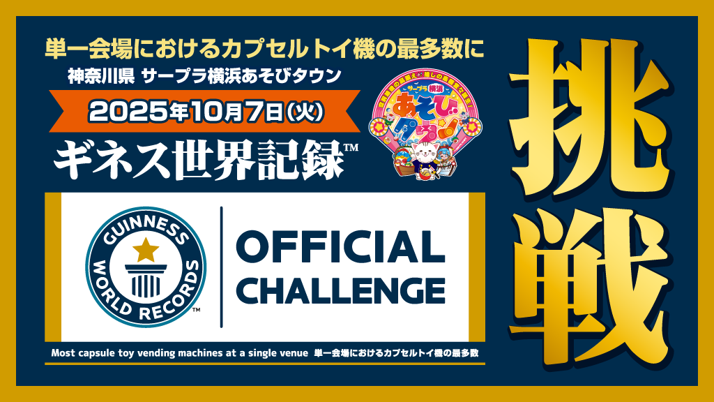 Third Planet株式會社(橫濱總部:神奈川縣橫濱市;社長兼CEO:兒玉淳;以下簡稱「本公司」)將於2025年10月7日(週二)在橫濱市都築區的「Serpla橫濱Asobi Town」挑戰扭蛋機安裝數量最多的吉尼斯世界紀錄™。挑戰數量為3,333台。本公司於2022年7月22日被認證為單一場所擁有最多抓娃娃機,目前維持著該紀錄。如果本次挑戰能夠證明本公司擁有全球最多扭蛋機安裝量,將同時獲得兩項金氏世界紀錄™。