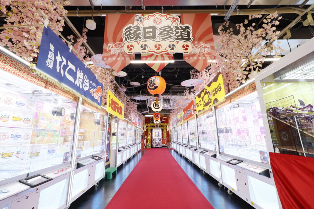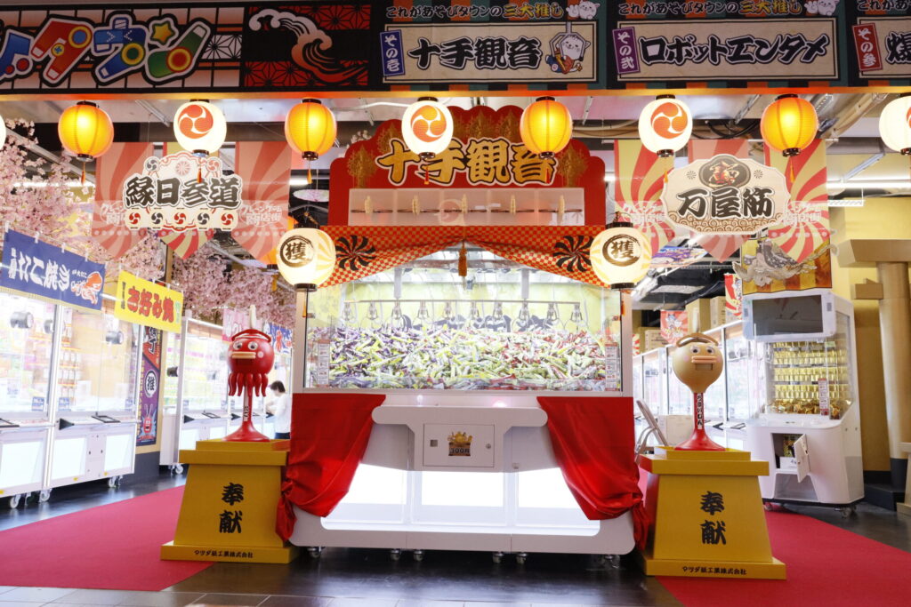 「娃娃機購物街」模仿的是繁華的購物街。我的第一選擇是「爆長橫丁」!請務必查看標有初學者標記的抓娃娃遊戲,因為獲勝率要高得多!第二個建議特別引人注目的是一台名為「Jutaku Kannon」的10臂起重機遊戲機!此機器僅在Asobi Town有售,請務必嘗試!和第三條建議「機器人娛樂」為我們的客戶注入活力!我想讓你微笑!到處都有 15 條克拉皮魚在向我們打招呼。以大阪為主題的各種設計和當地的歌謠將使阿索比鎮變得活躍起來!特別值得一提的是,玄武、青龍、白虎、朱雀四位神將竭盡全力為賓客加油的“元氣大明神”和以海外祭典為主題活躍氣氛的“桑巴狂歡節”千萬不要錯過!