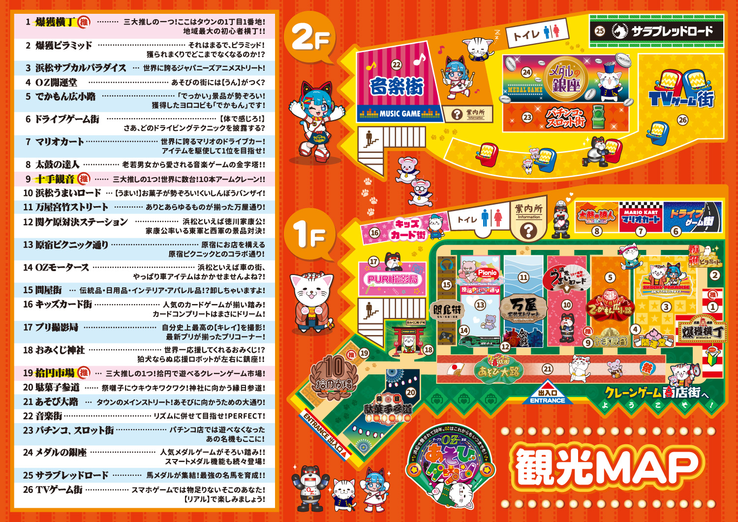 我們最喜歡的三個是我們原創的 10 臂娃娃機“十手觀音”、可以用 10 日元玩的娃娃機遊戲角“心緣市場”以及擁有最大的初學者的“爆齋橫町”。地區的角落! 2樓充滿了「音樂區」、「獎章銀座」、彈珠機/老虎機區、電視遊戲區、純種馬路等娛樂區!